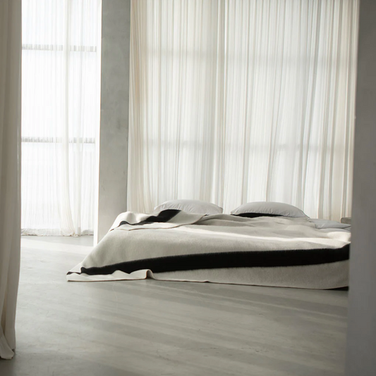THE SIEMPRE RECYLCED BLANKET - IVORY WITH BLACK STRIPE