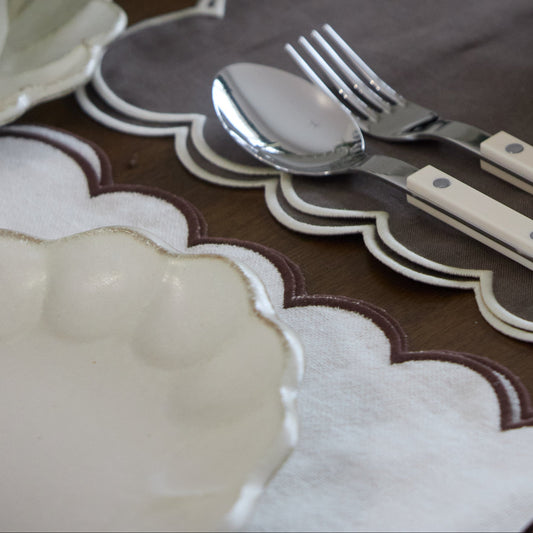 SCALLOPED LINEN PLACEMATS - OFF-WHITE/ CHOCOLATE