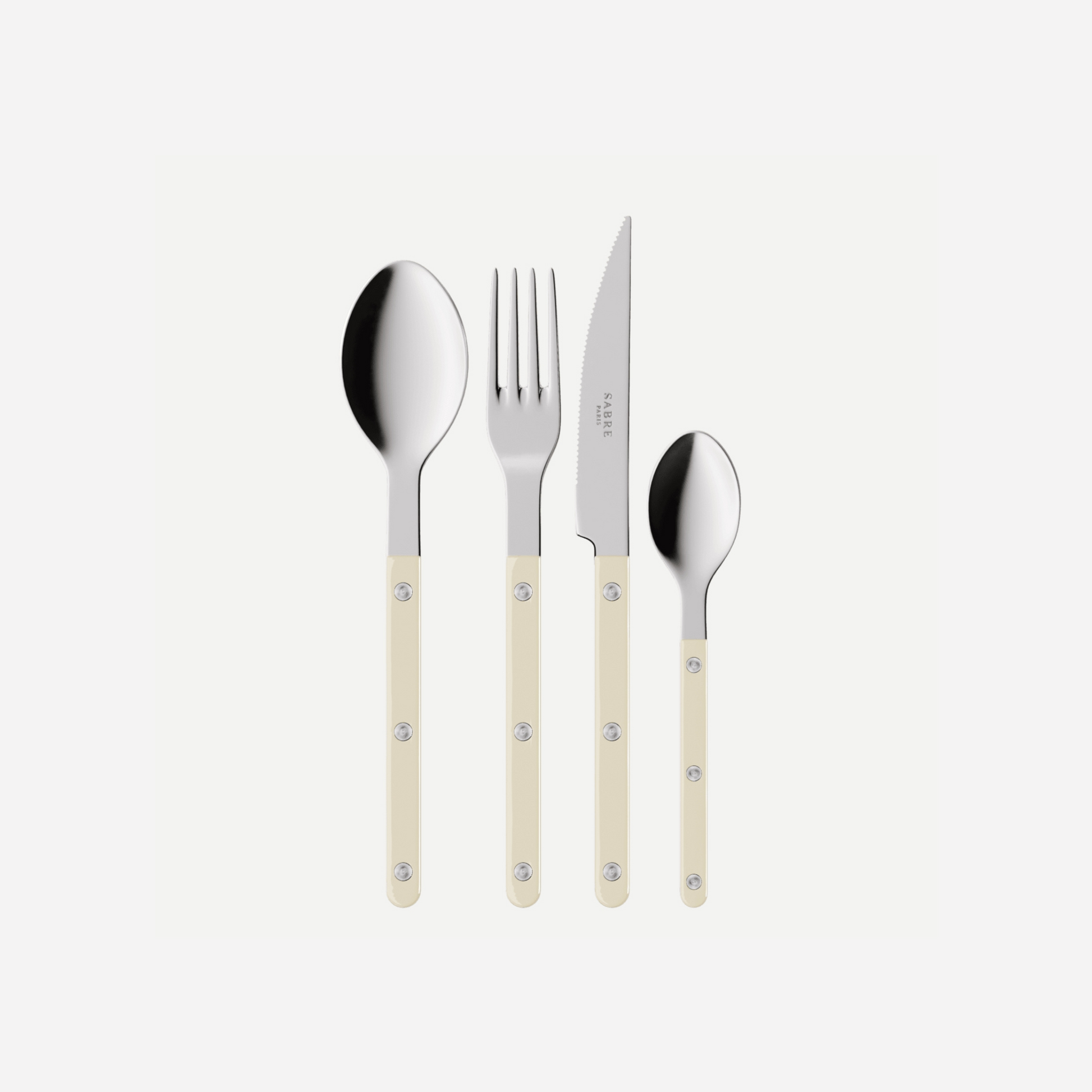 This 4-piece set includes 1 dinner fork, 1 soup spoon, 1 dinner knife and 1 teaspoon.