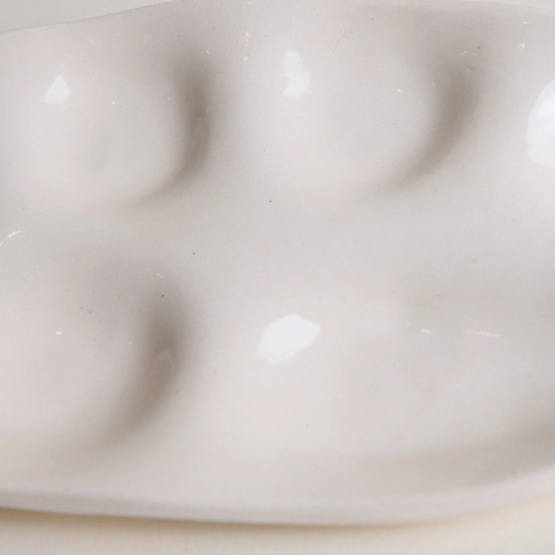 Crafted from white stoneware and finished with a glossy clear glaze, its softly contoured wells invite creativity at the table and beyond. Larger than the original snack plate, this piece offers added space and dimension while retaining its charming, organic silhouette.